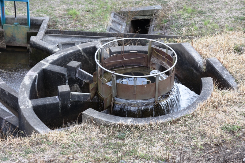 兵庫県加古川市にあるため池「原の大池」の放流口にある円筒分水。